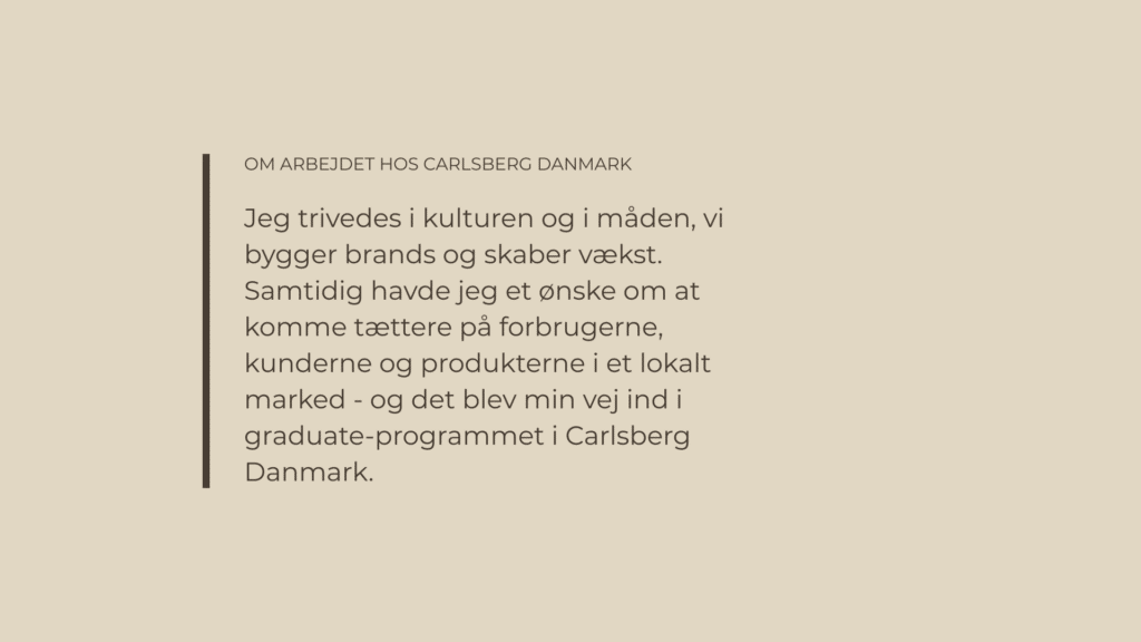Da jeg færdiggjorde min uddannelse, var jeg ikke i tvivl om, at jeg ønskede at fortsætte rejsen i Carlsberg. Jeg trivedes i kulturen og i måden, vi bygger brands og skaber vækst. Samtidig havde jeg et ønske om at komme tættere på forbrugerne, kunderne og produkterne i et lokalt marked – og det blev min vej ind i graduate-programmet i Carlsberg Danmark.