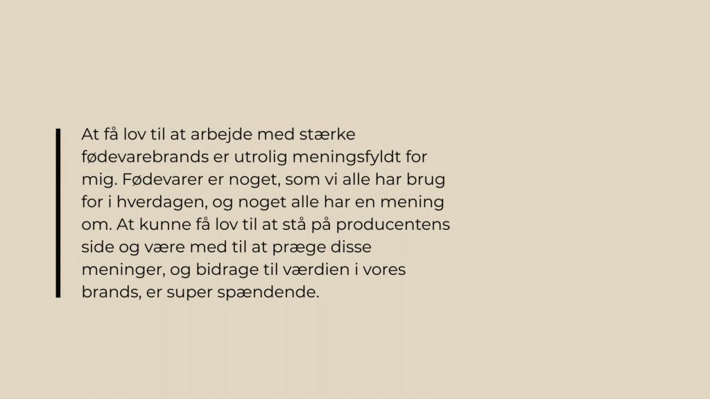 At få lov til at arbejde med stærke fødevarebrands er utrolig meningsfyldt for mig. Fødevarer er noget, som vi alle har brug for i hverdagen, og noget alle har en mening om. At kunne få lov til at stå på producentens side og være med til at præge disse meninger, og bidrage til værdien i vores brands, er super spændende.